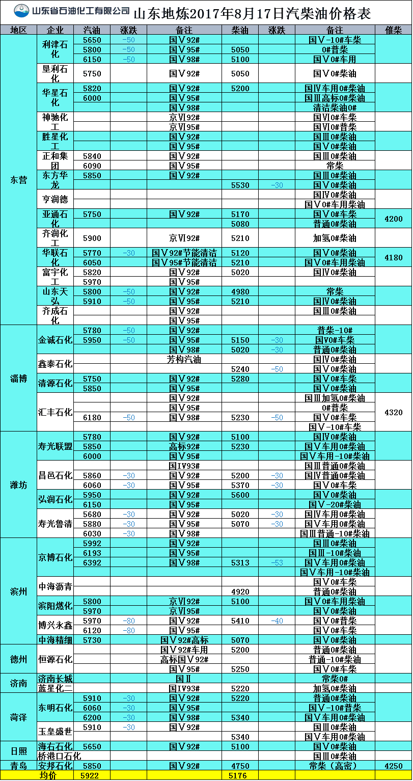 山東地煉2017年8月17日汽柴油價格表
