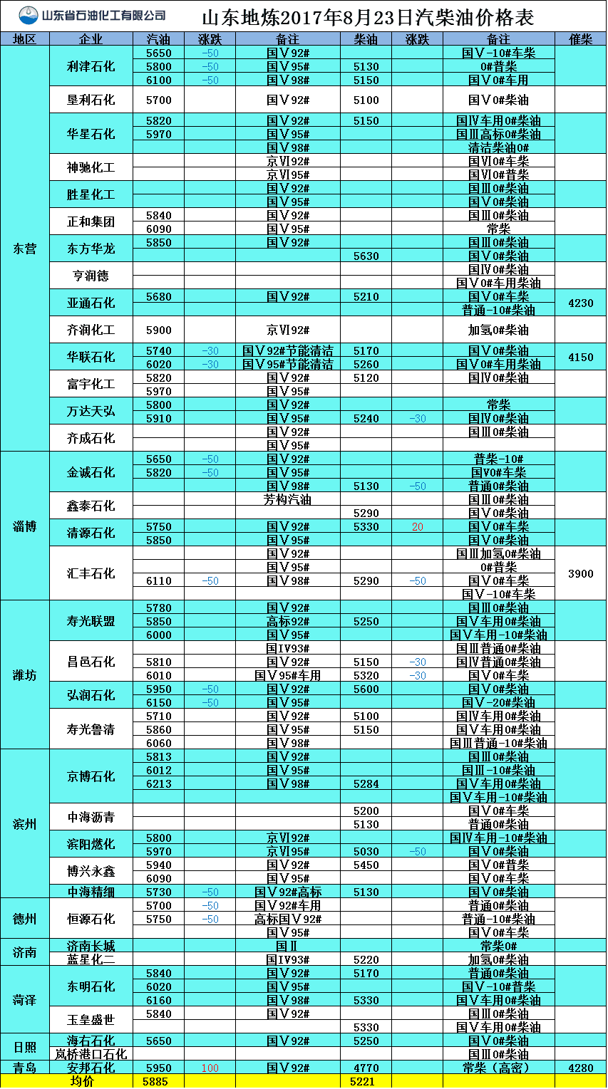 山東地?zé)?017年8月23日汽柴油價(jià)格表