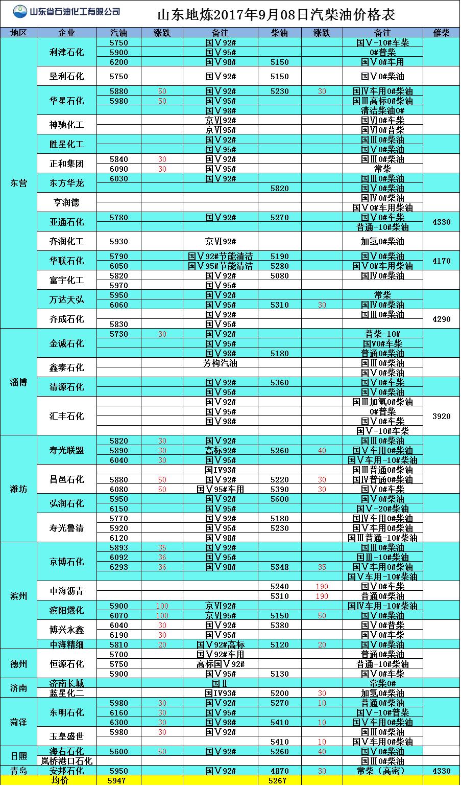 山東地煉2017年9月08日汽柴油價格表