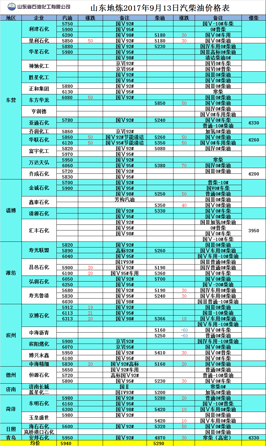 山東地?zé)?017年9月13日汽柴油價(jià)格表