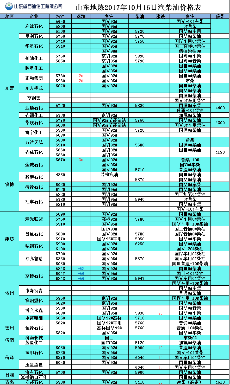 山東地?zé)?017年10月16日汽柴油價(jià)格表