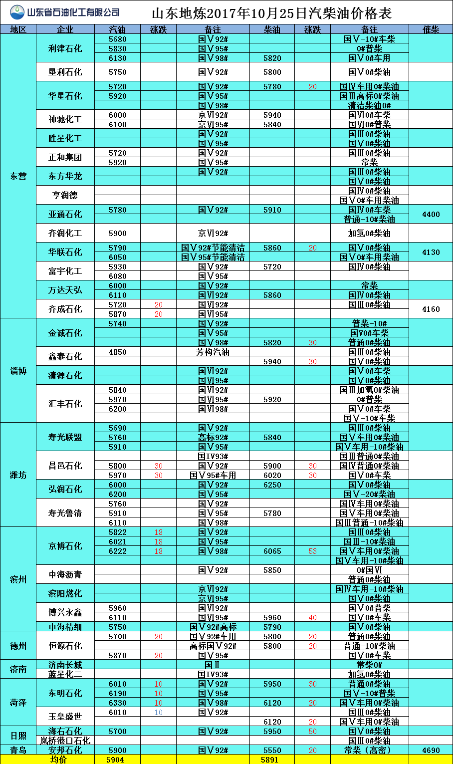 山東地?zé)?017年10月25日汽柴油價(jià)格表