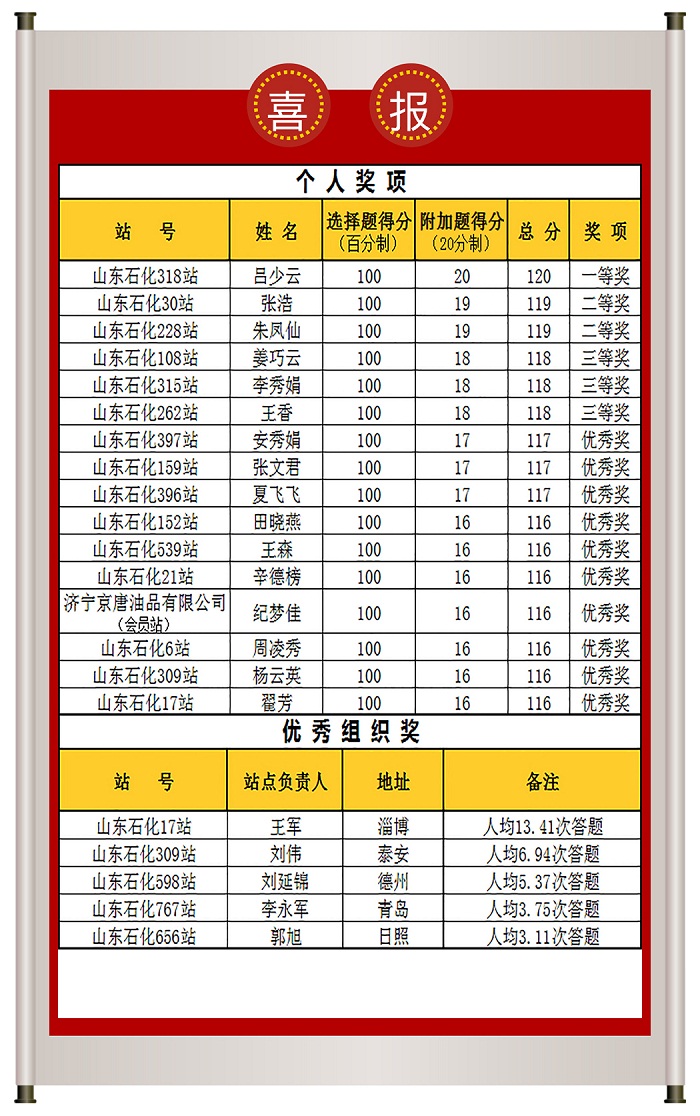 1月9日,山東石化“培訓(xùn)回頭看”知識競賽圓滿落幕。本次知識競賽面向山東石化各加盟站點(diǎn)展開,形式推陳出新,采用線上答題形式進(jìn)行比拼。競賽共有779人參與,獲得答卷1364份。經(jīng)教官評委打分,最終有16人獲個(gè)人獎(jiǎng),5個(gè)站點(diǎn)獲得優(yōu)秀組織獎(jiǎng)。
