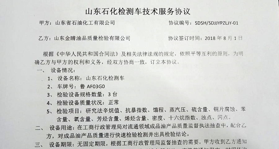 8月1日,山東石化與濟寧金睛油品質(zhì)量檢測有限公司簽署技術(shù)服務(wù)協(xié)議,山東石化移動油品檢測車從此開始肩負起外部加油站油品檢測的重任。