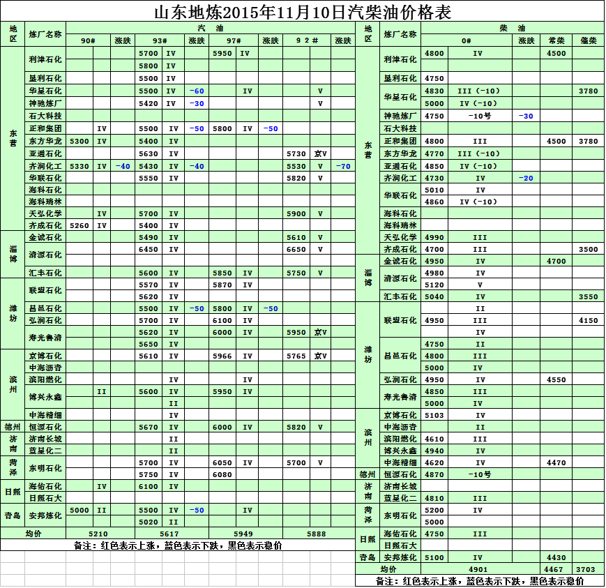 2015年11月10日山東地煉汽柴油價格表