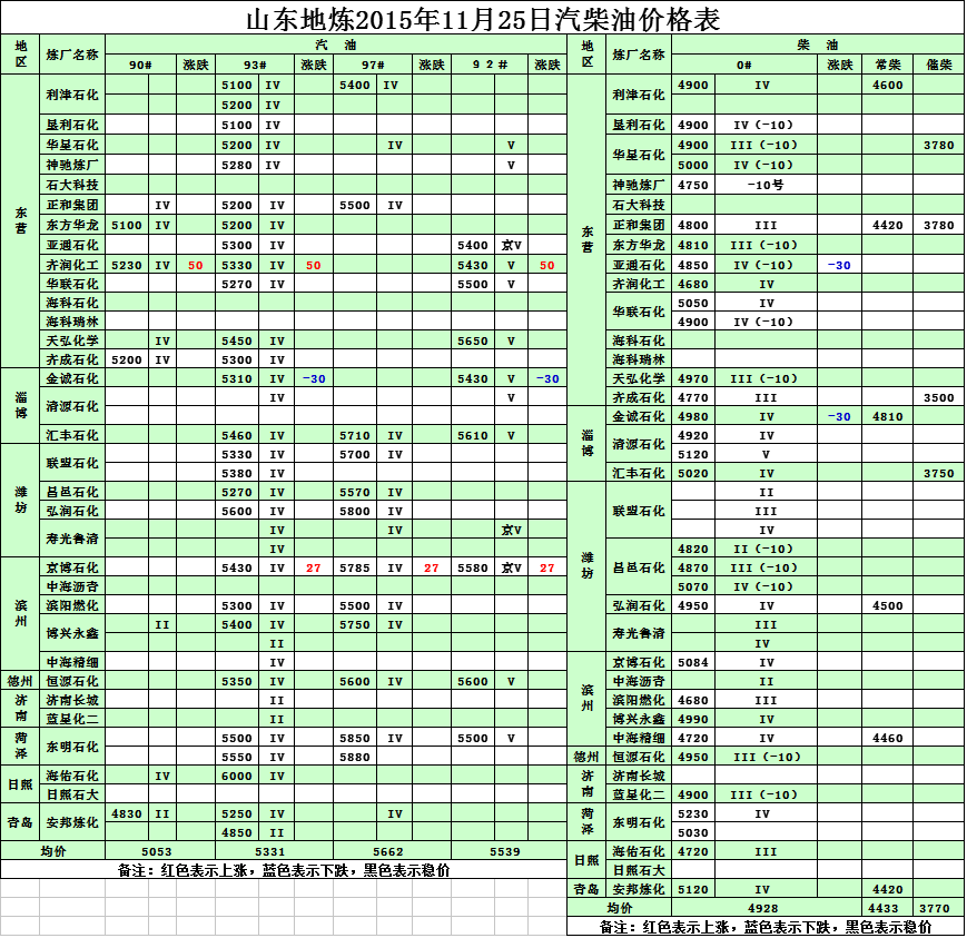 2015年11月25日山東地煉汽柴油價格表