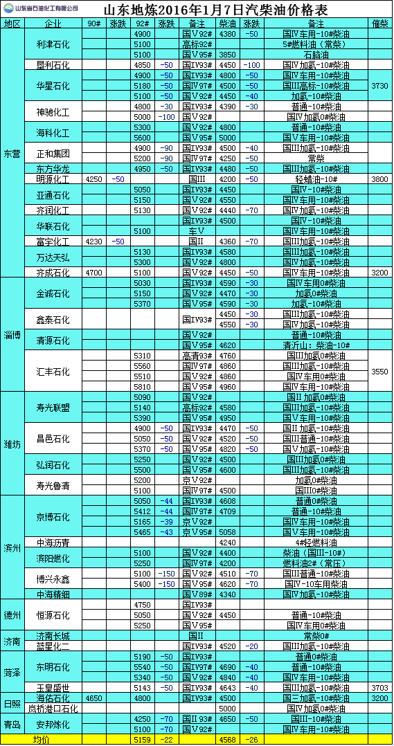 2016年1月7日山東地?zé)捚裼蛢r(jià)格表