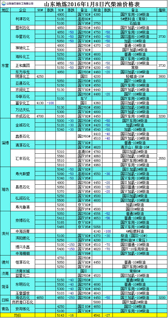 2016年1月7日山東地?zé)捚裼蛢r格表