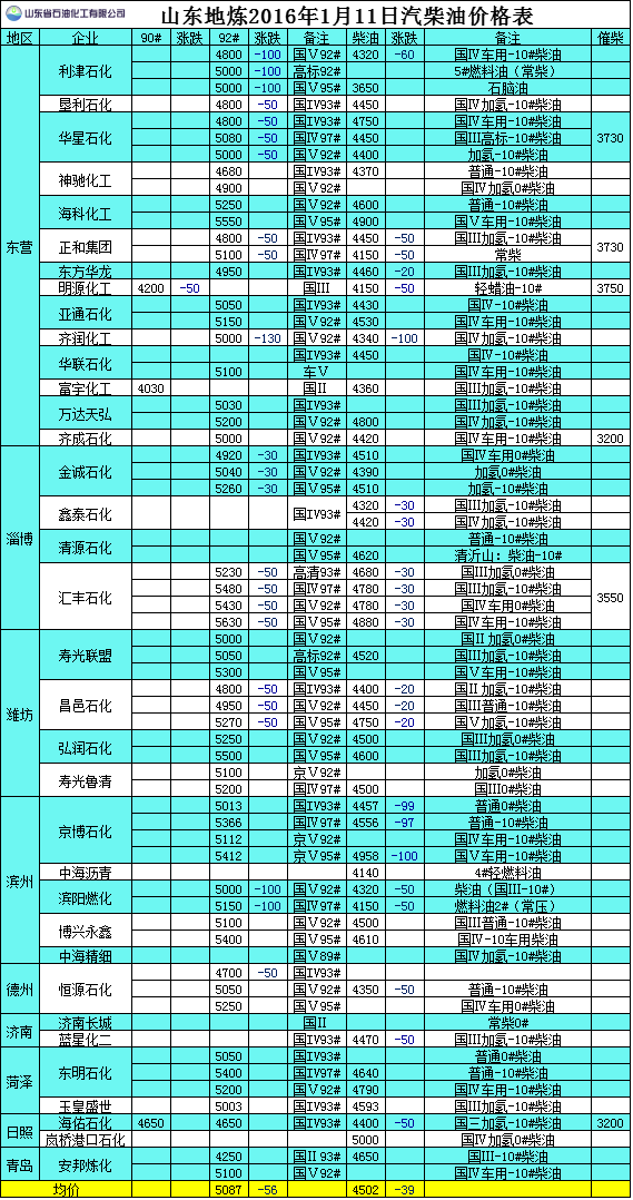 2016年1月12日山東地?zé)捚裼蛢r(jià)格表