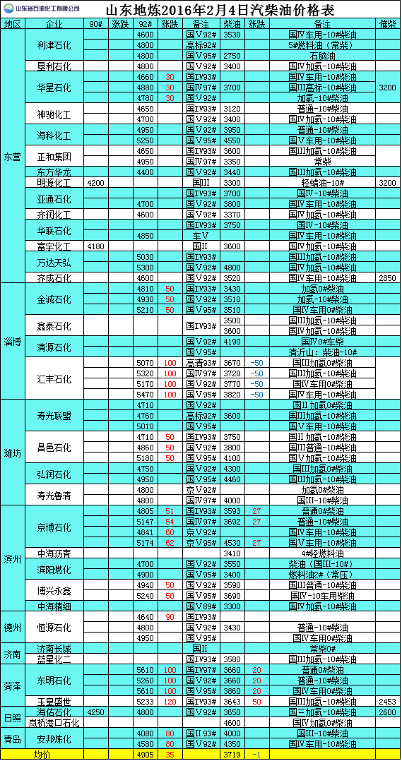 2016年2月4日山東地?zé)捚裼蛢r格表
