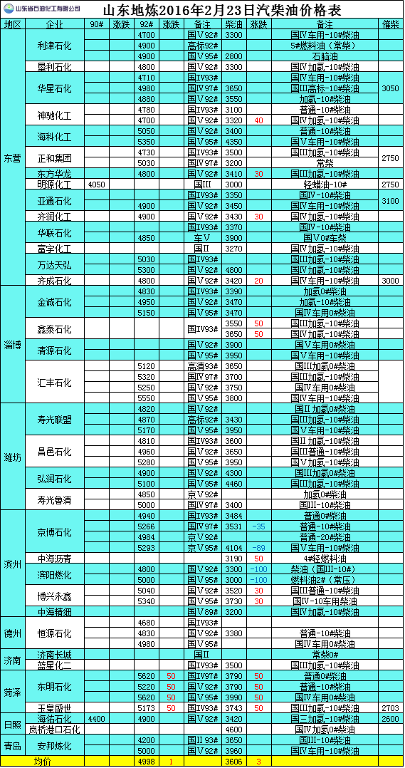 2016年2月23日山東地煉汽柴油價格表