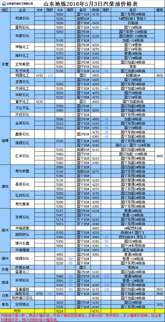 2016年5月3日山東地煉汽柴油價格表