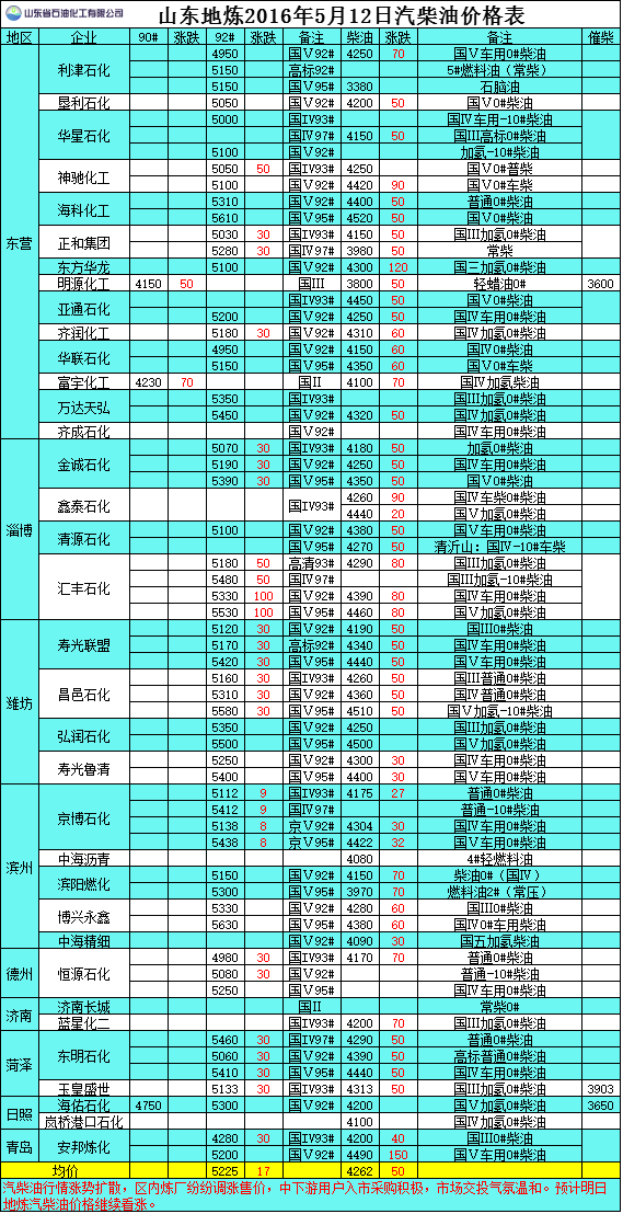 2016年5月12日山東地煉汽柴油價格表