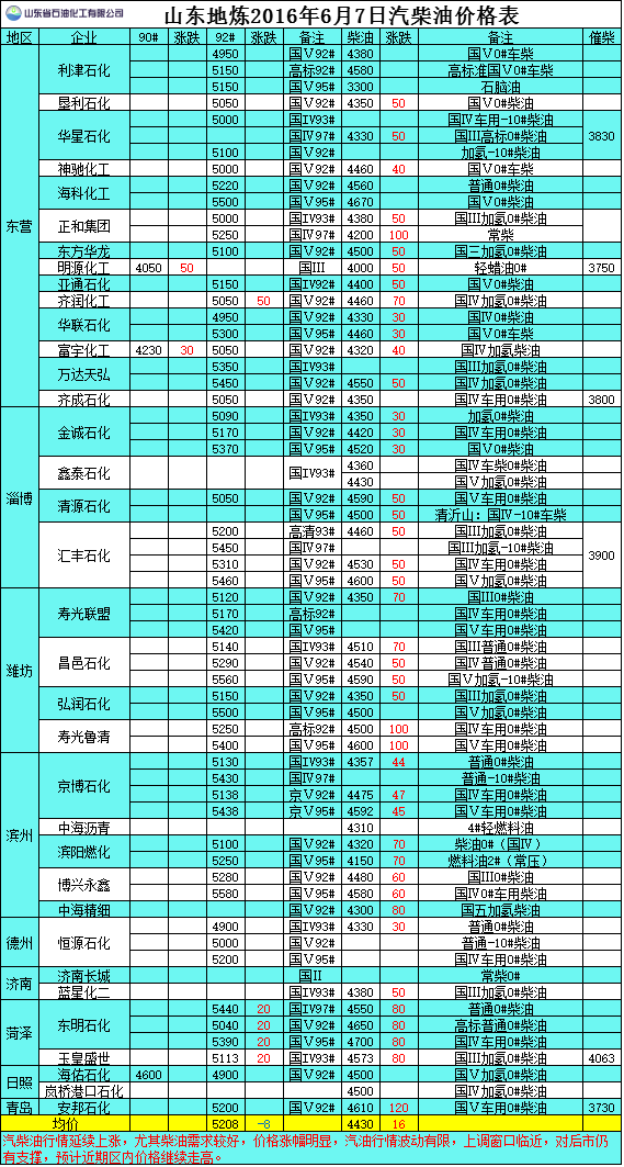 2016年6月7日山東地煉汽柴油價格表