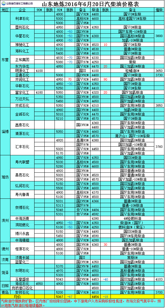 2016年6月20日山東地煉汽柴油價格表