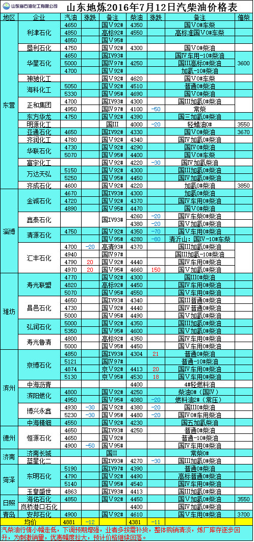7月12日山東地煉汽柴油價格