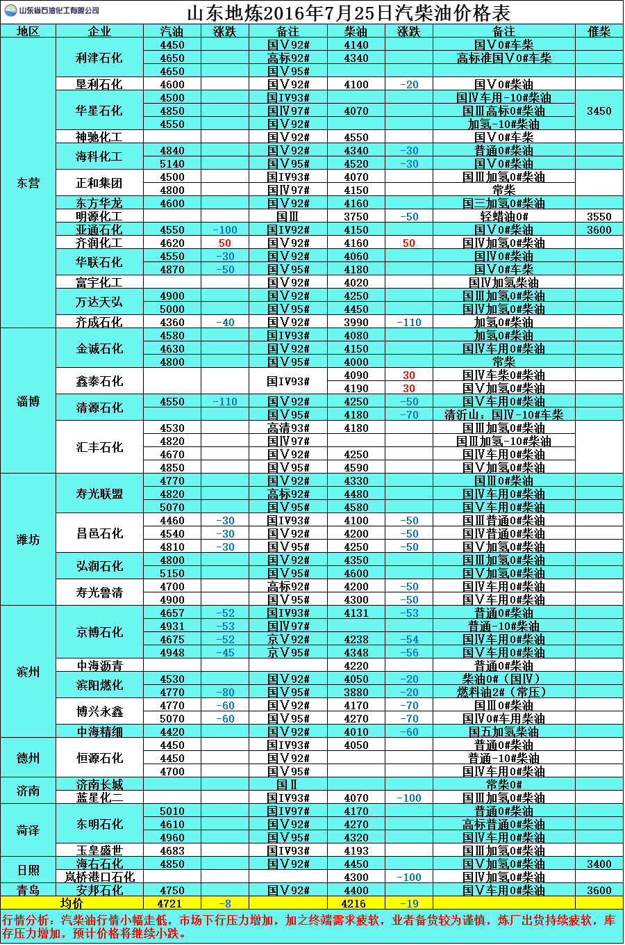行情分析:汽柴油行情小幅走低,市場下行壓力增加,加之終端需求疲軟,業(yè)者備貨較為謹(jǐn)慎,煉廠出貨持續(xù)疲軟,庫存壓力增加,預(yù)計價格將繼續(xù)小跌。