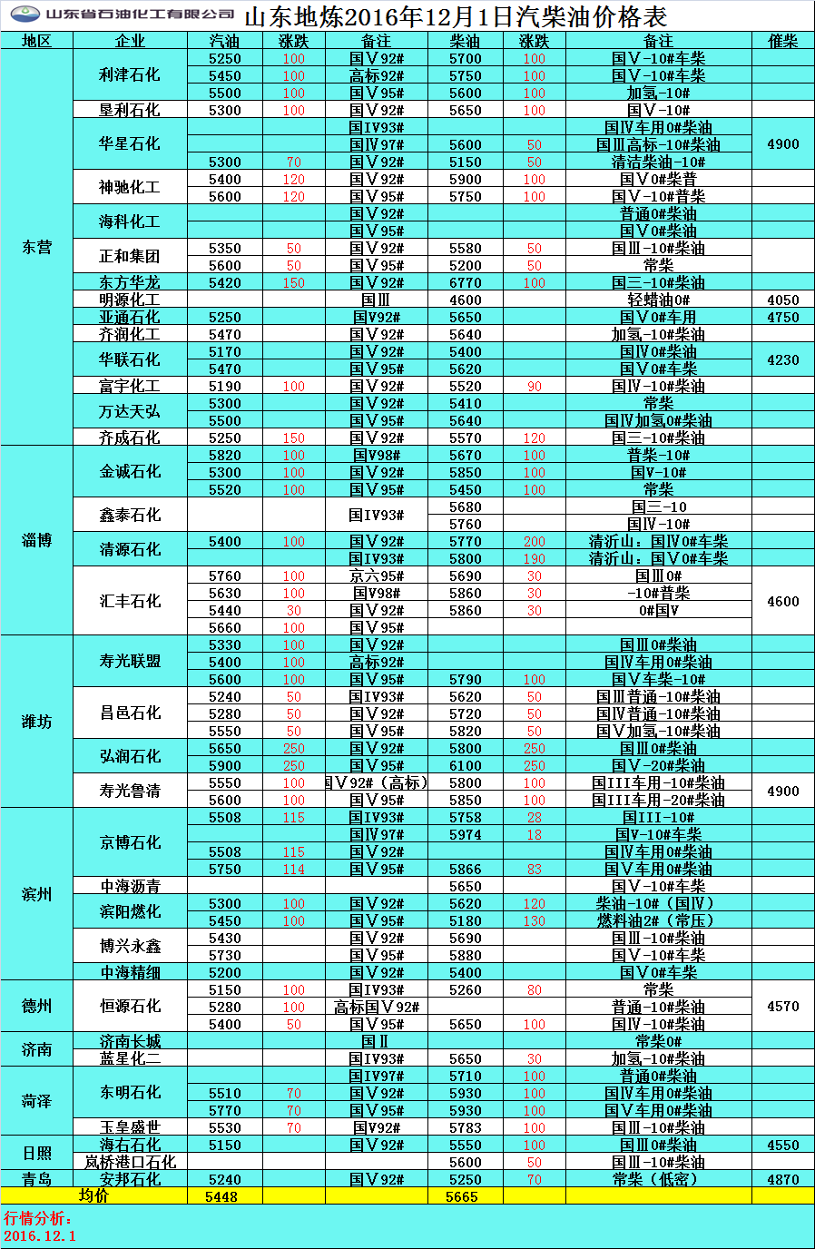 12月1日山東地煉汽柴油價格