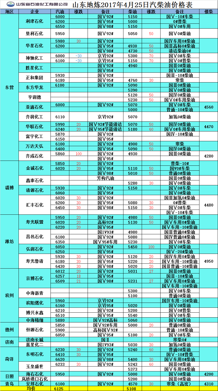 2017年4月25日山東地煉汽柴油價格