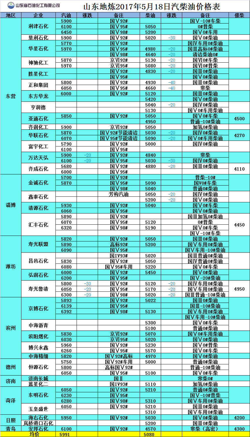 2017年5月18日山東地煉汽柴油價格